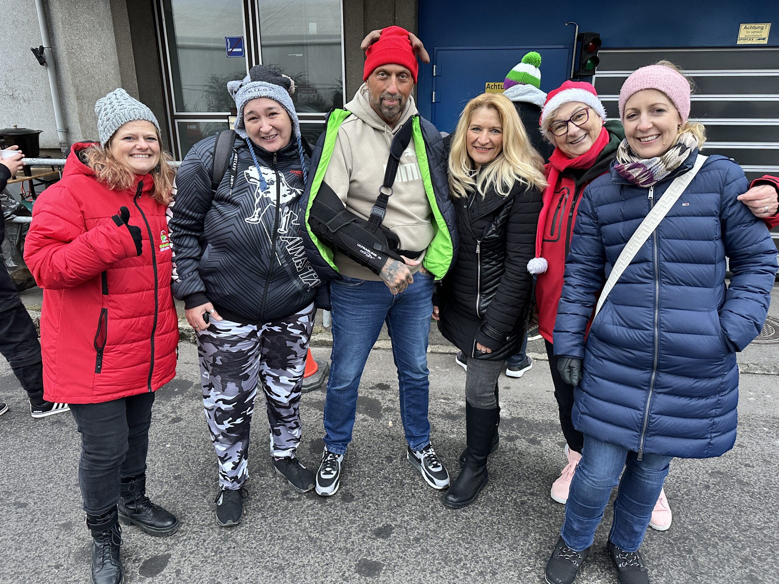 Unsere Andrea stimmt hinten, bei den ersten Schützlingen, die sich in die Warteschlange stellten, das Lied „Feliz Navidad“ an, Verena und Sonja unterstützen sie und tanzen vor der ÖBB Einfahrt gemeinsam einen Hauch von Ballett, rechtes Bein vor, linkes Bein vor, und mit lauter Stimme wird „Feliz Navidad“ intoniert. Spaßig mitanzuschauen und wir haben eine gute Stimmung.