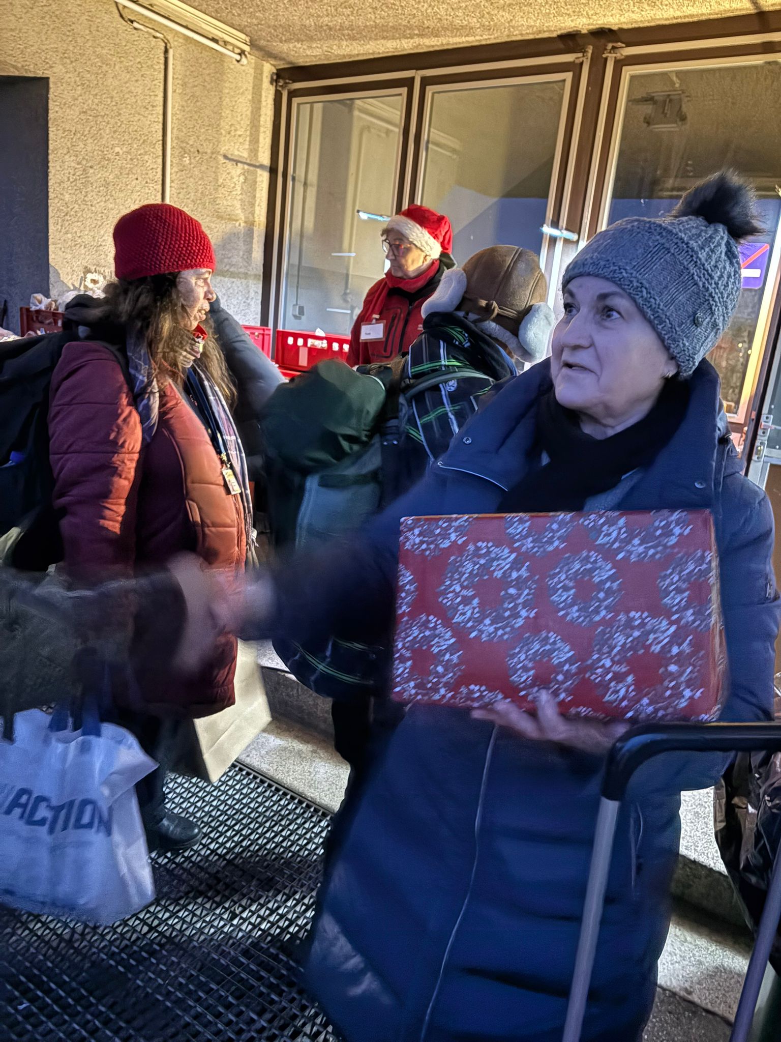 Bei Christian S., der heute gemeinsam mit Barbara die Weihnachtsgeschenke an die Menschen ausgibt, laufen alle emotionale Banden konzentriert zusammen. Viel Freude, ganz viele Danksagungen und noch mehr Umarmungen, wunderbar anzuschauen. Nina und Rene sowie Andrea und Verena im Büro haben eine super Stimmung und freuen sich ob ihrer Aufgabe heute, Hygieneartikel und Süßigkeiten auszugeben.