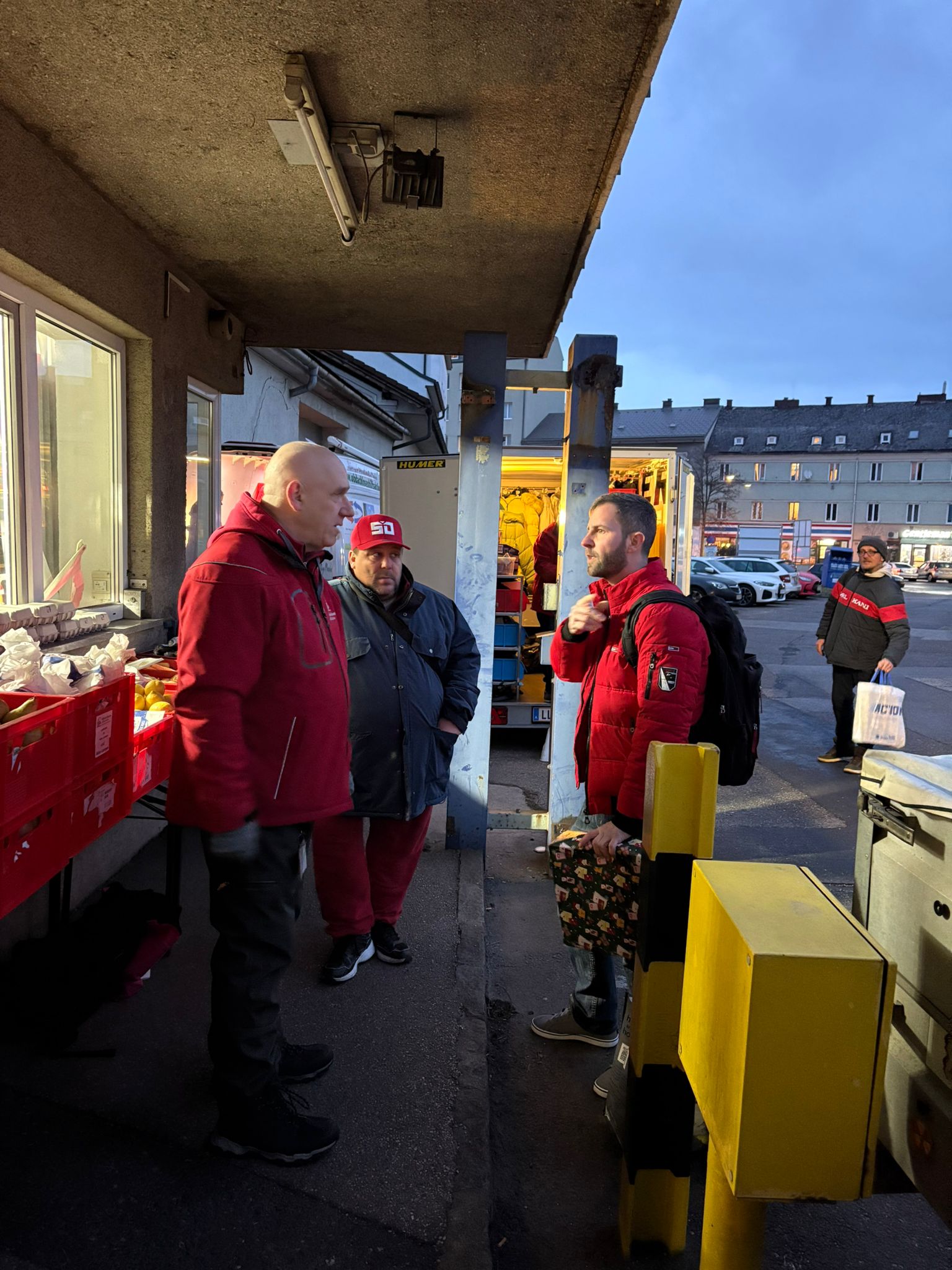 Angekommen in Linz warten schon einige Personen, die uns heute helfen wollen. Wir stellen die Tische auf, lassen die Plane noch liegen und entscheiden erst später, ob wir sie aufhängen zum Schutz vor Regen und Schnee, das heute gemeldet wurde. Nina, die Frau von Rene, hilft ihrem Mann im Büro und sie räumen auch gleich alle mitgebrachten Dosen in die Regale. Der Gasofen ist angeheizt, im Büro ist es zumindest temperiert, nicht so kalt wie heraussen, wo der kalte Wind auch noch dazukommt.