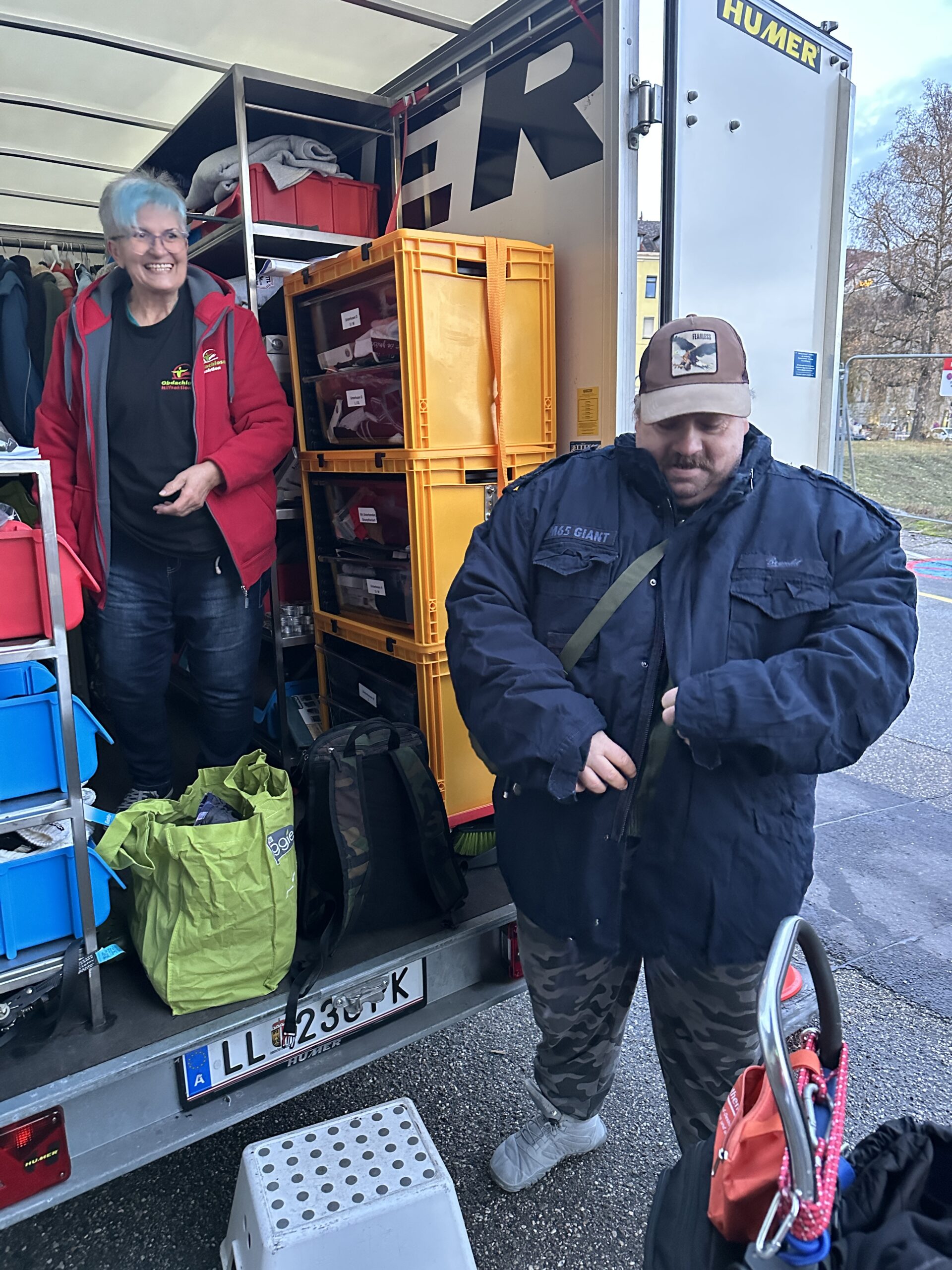 Rene und Verena räumen, ohne dass ich es mitbekommen habe, den Bus ein und wir brechen um 13.50 Uhr auf, Richtung Linz, zu unserem Verteilplatz. Dort ausräumen, den Anhänger abstellen und ausrichten, den ganzen Bus ausräumen und in die Regale im Büro einsortieren. Alle helfen zusammen, einfach toll!