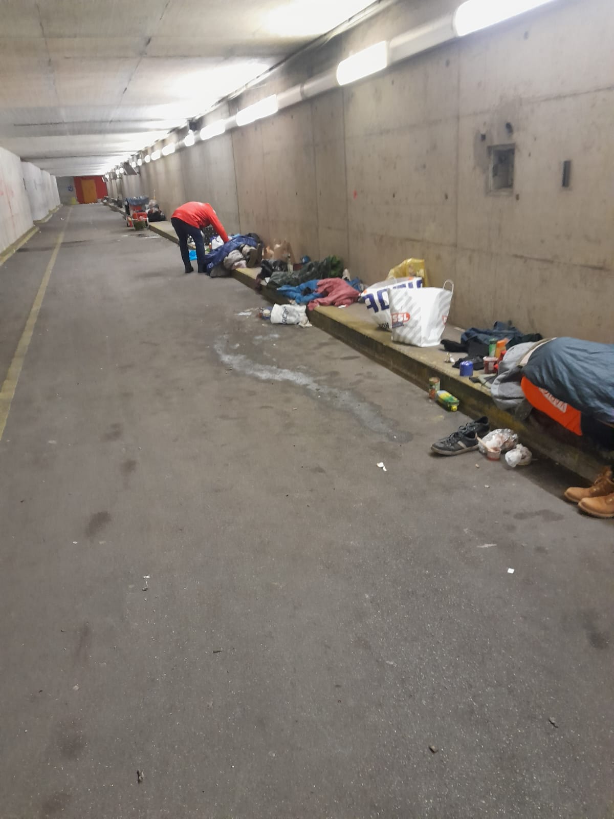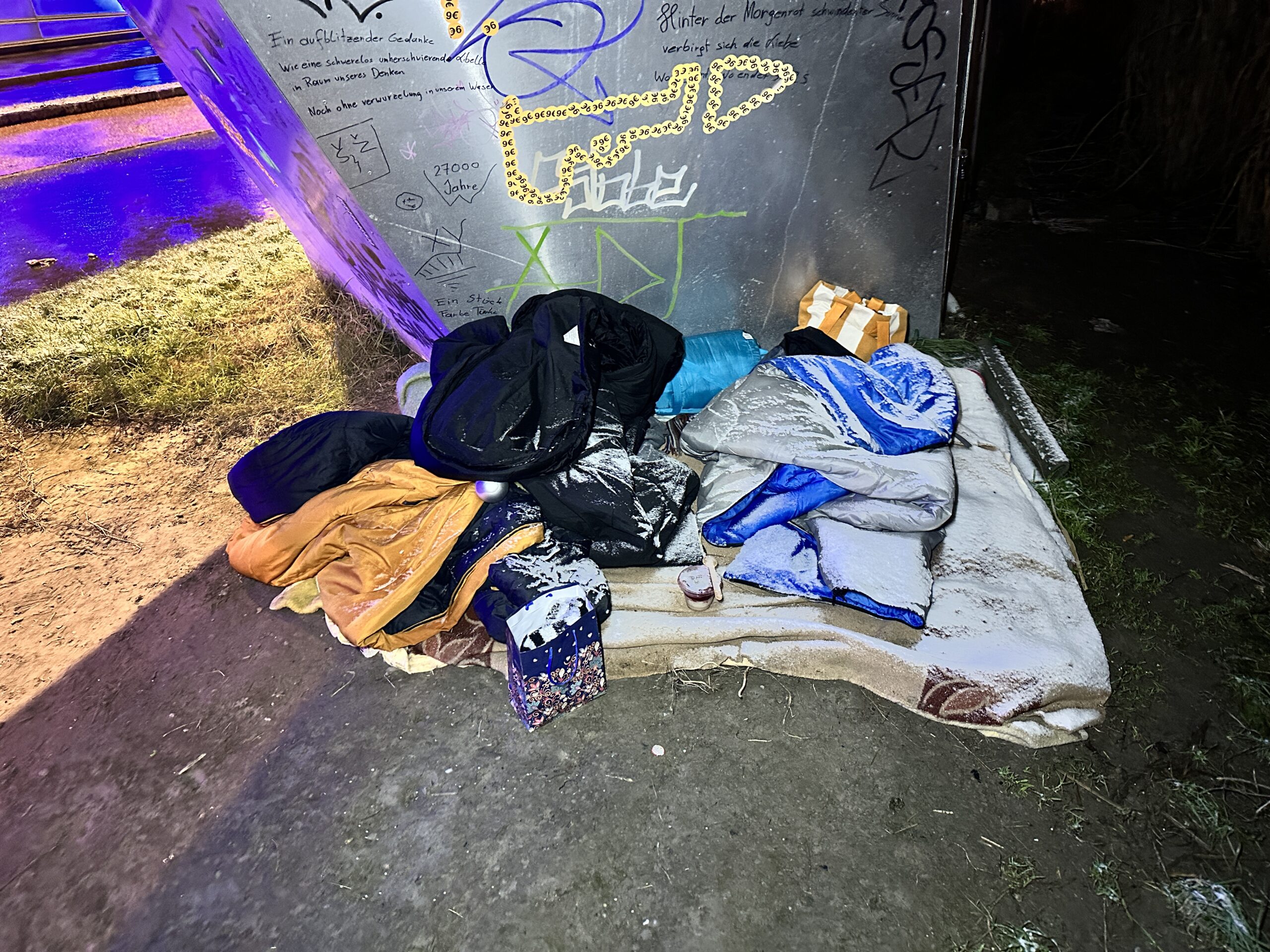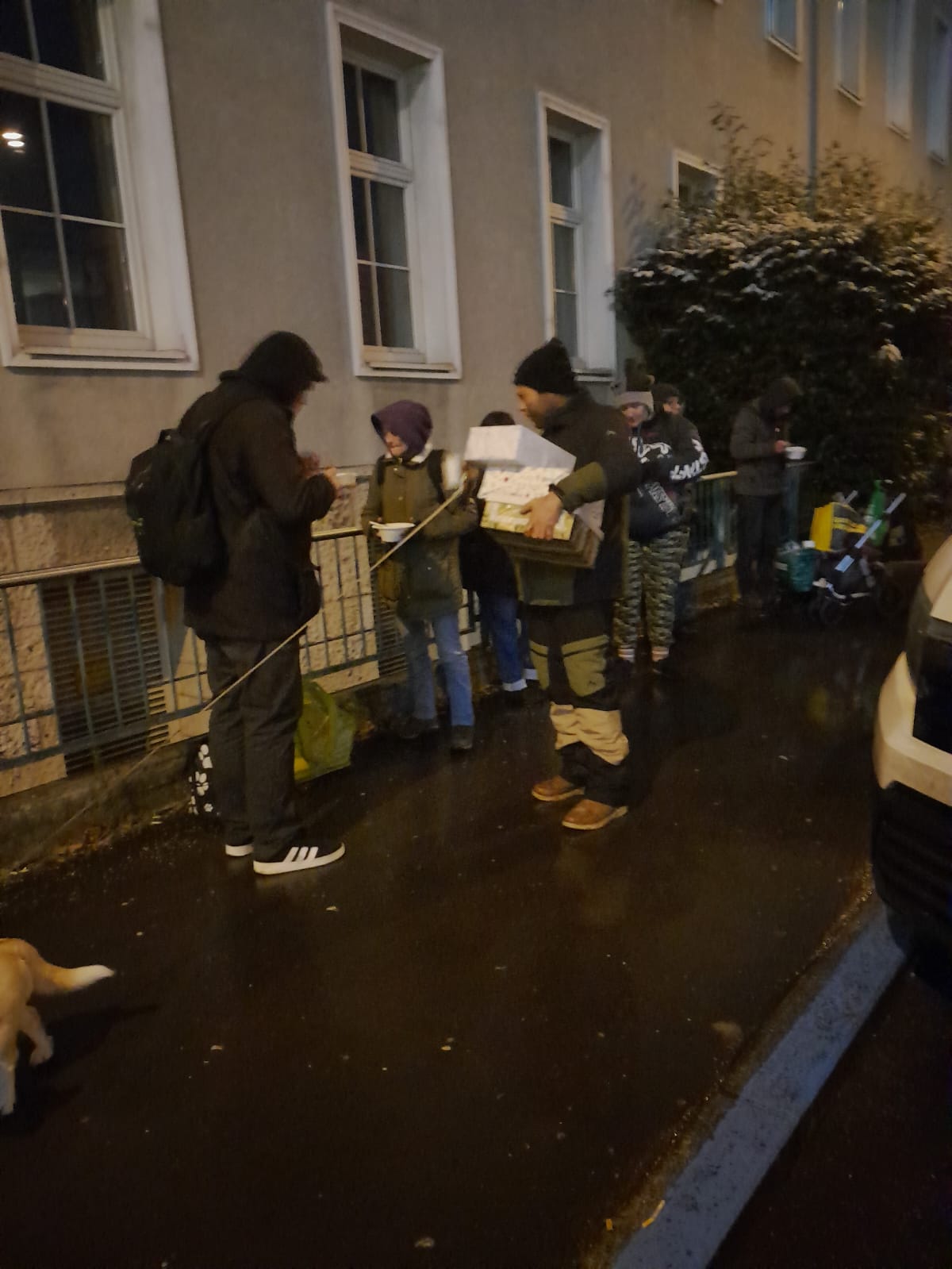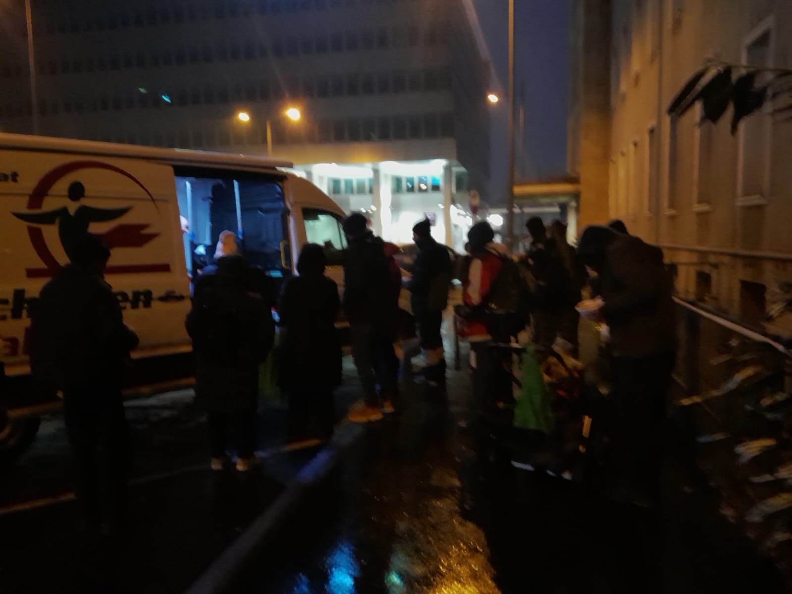 Der nächste Weg geht nochmal in die Innenstadt, da ruft uns jemand an, Zitat: „Wir haben gestern 10 Liter Hühnerbrühe gekocht und haben euch vorher am Bahnhof gesehen, drum rufe ich an. Habt ihr eine Ahnung wo wir Obdachlose finden denen wir die Suppe geben können?“ Leider kann ich keine Schlafplätze oder Hot Spots weitersagen, die wurden mir im Vertrauen gesagt, das erzähl ich nicht weiter. Ich sagte ihnen auch dass wir selbst auch Gulasch dabei haben und austeilen, genervt verabschiedet er sich und ist hörbar echauffiert. Aber das kann ich nicht machen, Plätze weiterzusagen, an denen sich unsere Schützlinge befinden, das mache ich auch nicht.