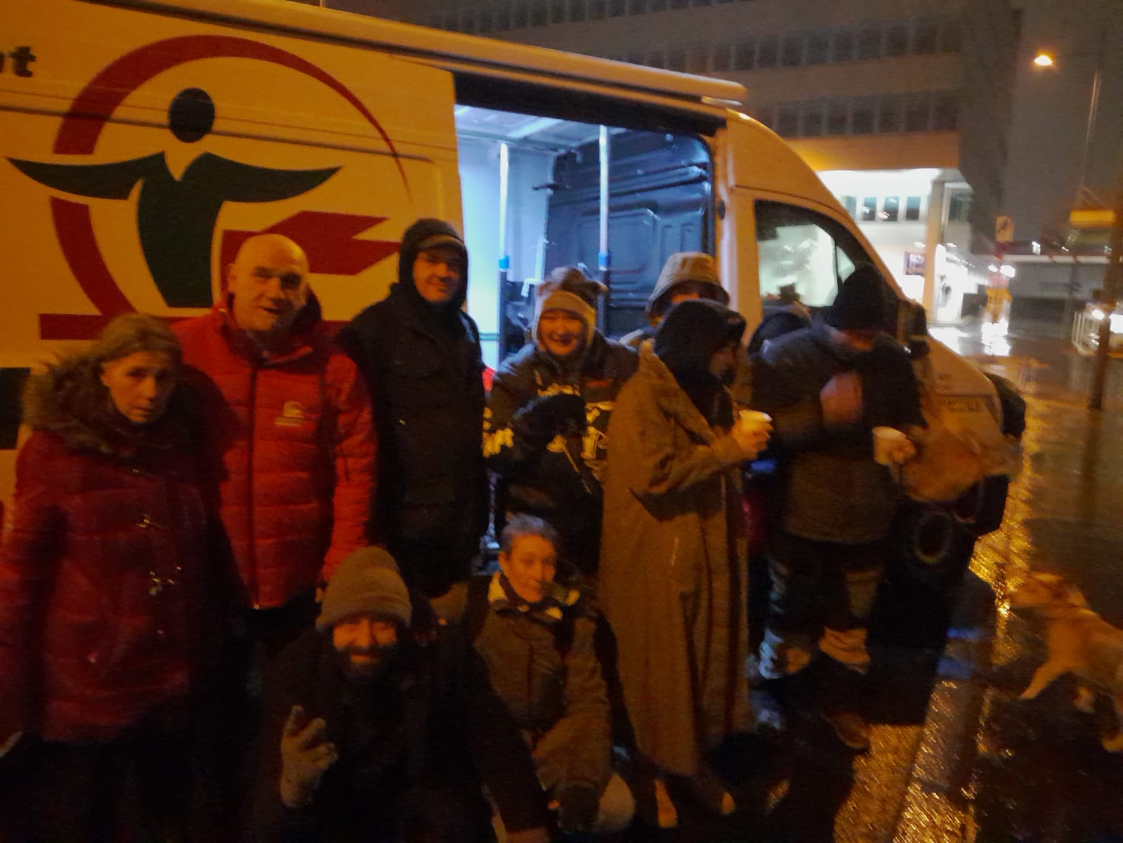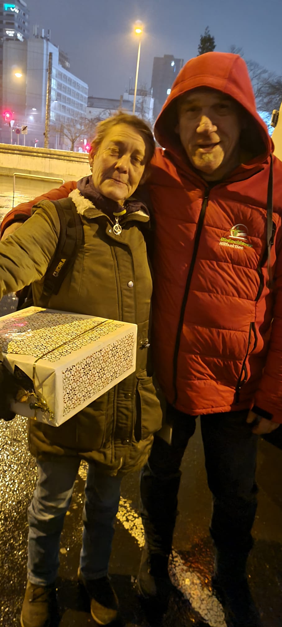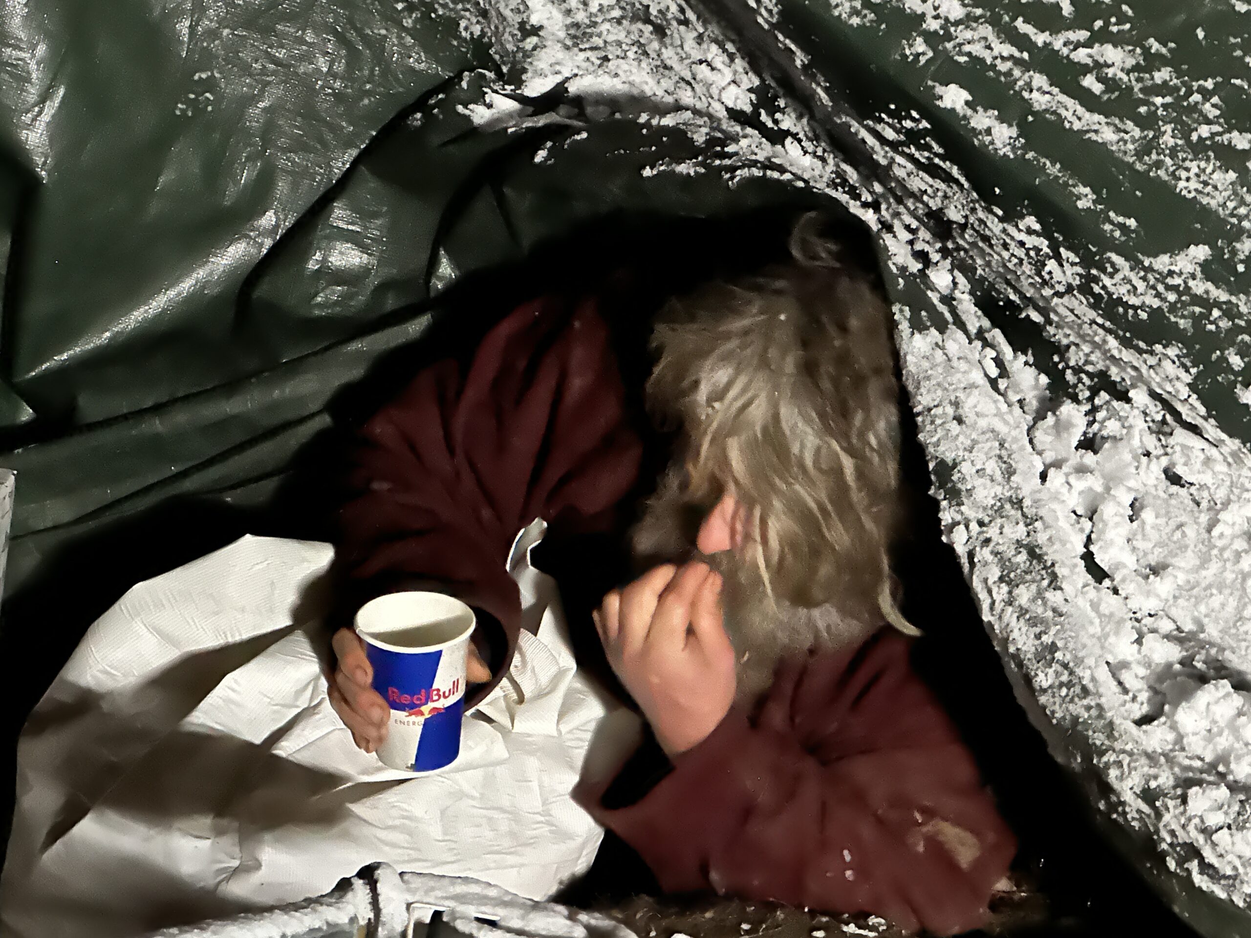 Wir lassen den Hauptbahnhof hinter uns und brechen noch auf, Gerald zu finden., der vorher nicht in der Autobushütte war. Von Weitem sehe ich dass er sich zusammenkringelt unter einer dünnen Decke, ich wecke ihn sanft auf und biete ihm heißes Gulasch und heißen Tee an, was er dankend annimmt. Er ist hellwach und viel schmäler geworden, von diesem Mann ist nicht mehr viel da, er hat keine körperlichen Ressourcen mehr, auf die er bei Kälte zurückgreifen könnte. Er schlürft am Tee und löffelt an seinem Gulasch, ist überglücklich etwas Warmes in seinen Bauch zu bekommen, ein Weihnachtsgeschenk nimmt er nicht an, Zitat: „Ich habe hier keinen Platz zum lagern“. Ich verspreche Gerald eine Packung Zigaretten aus meiner privaten Tasche wenn wir kommenden Samstag wieder vorbeikommen.