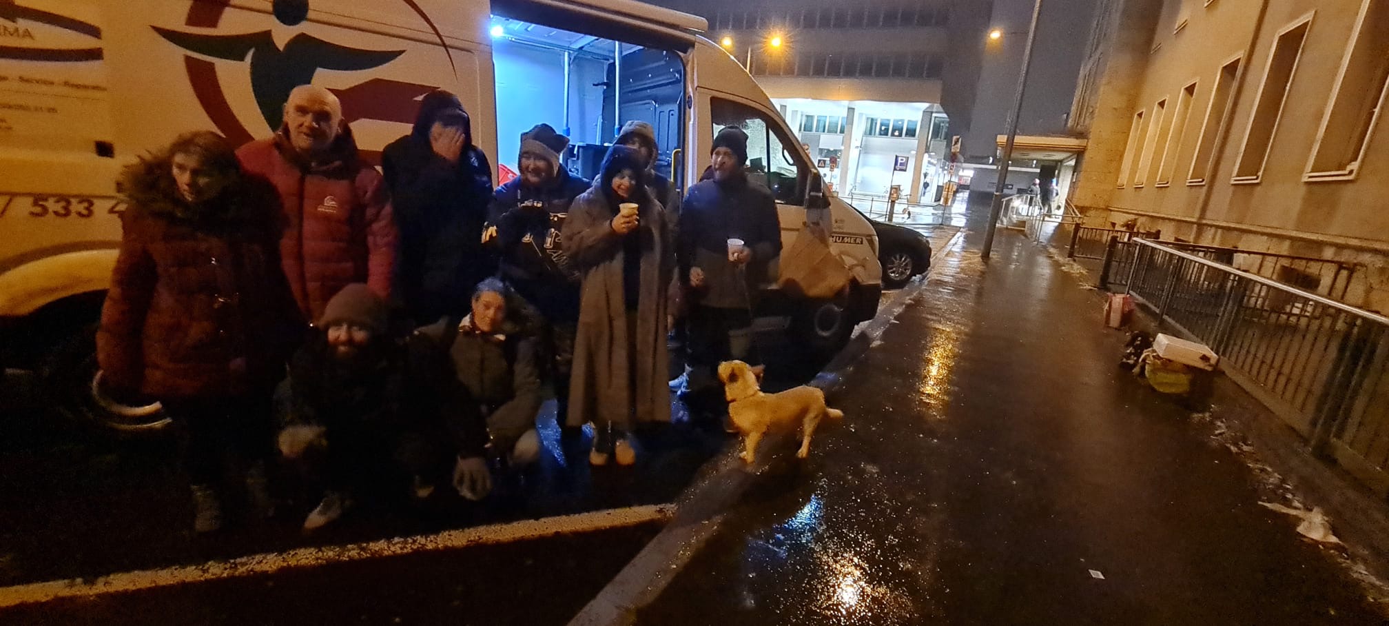 Alle essen genüsslich bei Schneefall unter freiem Himmel, auch unser Tony, der mir immens wichtig ist als Mensch. Danach füllen wir noch die eine oder andere Einkaufstasche mit Lebensmitteln und Hygieneartikeln, und natürlich mit euren Weihnachtsgeschenken. Alles wird liebend gerne angenommen, Fischdosen, Cabanossi, Brot, süßes Gebäck, Kekse, Getränke, manche bräuchten Unterwäsche und Socken, aber Fehlanzeige, ich suche alles durch und finde nichts passendes, nur kleine Größen, Mist! Erst jetzt merke ich dass wir 9 Damen-Winterjacken und nur 1 Herren-Winterjacke mit dabei haben, ärgerlich. Ich vertröste unsere Schützlinge auf den Verteiltag nächste Woche, aber 3 von den Schützlingen haben zerrissene Jacken an und bräuchten jetzt sofort eine neue.