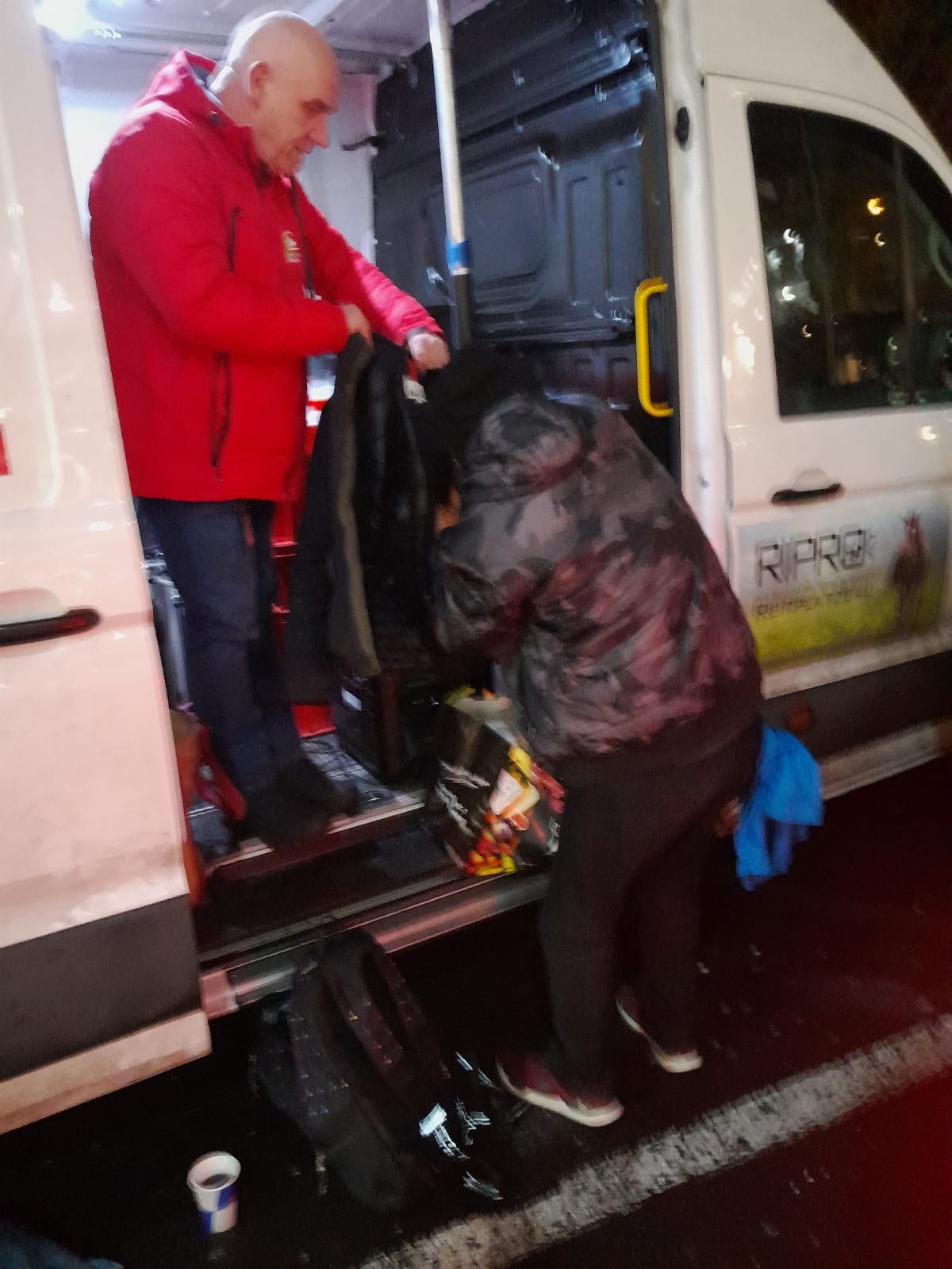 Tommy und ich laden die Boxen mit den Lebensmitteln und mit der Kleidung in den Bus, mit dabei haben wir auch warme Schlafsäcke, Isomatten, und da ich leider zu wenig genau hinschaute, hatten wir lediglich 1 warme Herren-Winterjacke mit dabei, und 9 (!) Damen-Winterjacken. Leider habe ich das Paket selbst nicht zusammengestellt, künftig werde ich das aber wieder selbst machen, da wir auch keine einzige Herren-Unterhose außer Größe S und M dabei hatten, aber auch das merkte ich erst viel zu spät in Linz. Ebenso hatten wir weder einen warmen Kapuzen-Sweater noch einen warmen Pullover mit dabei, all die wichtigen Sachen fehlten heute total, und wir hätten sie so dringend gebraucht.