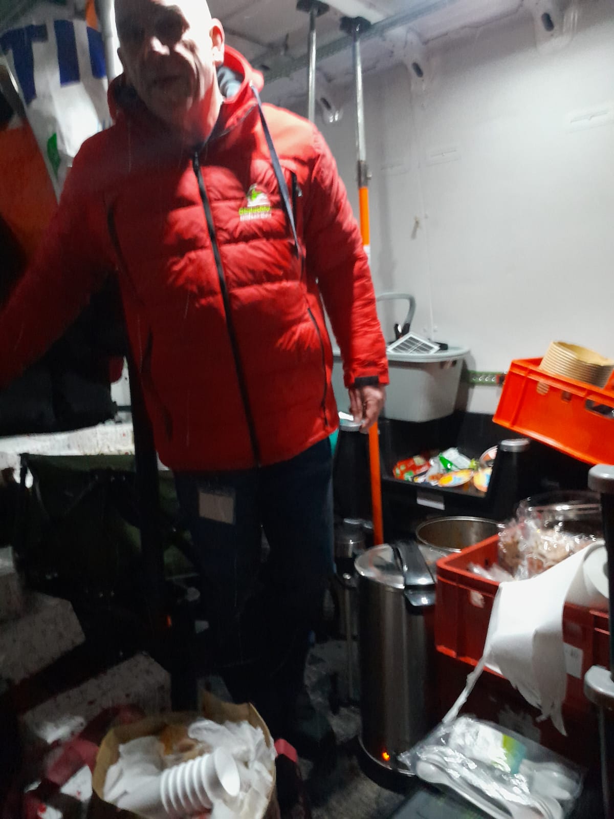 Wir teilen zuerst heißen Tee und heißes Gulasch aus, entweder zum hier essen oder zum Mitnehmen, mit Semmel. Die meisten essen hier vor Ort. Allen schmeckt das tolle Gulasch von Daniela und Peter, DANKE auch an dieser Stelle noch einmal.