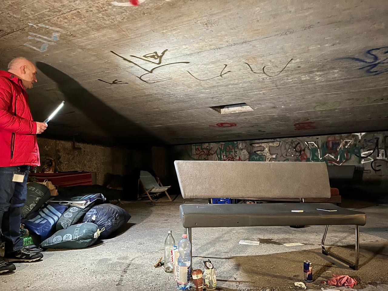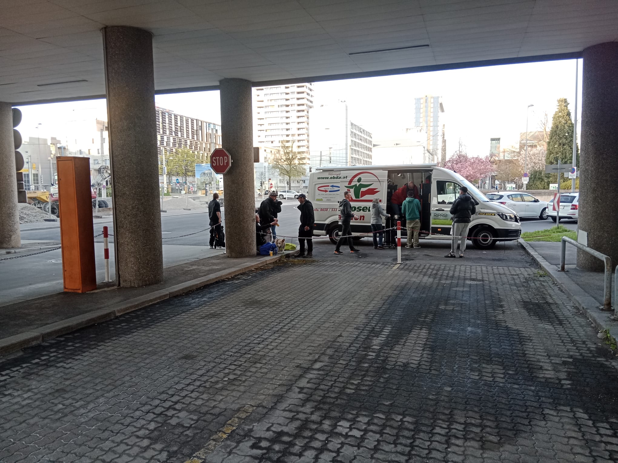 Nach ein paar Minuten gehen wir weiter in die Bahnhofstiefgarage, wo wir weitere Obdachlose vermuten. In der Garage angekommen sehen wir von Weitem 2 junge Männer, wie sie reden. Wir gehen hin und fragen, ob sie etwas brauchen, Lebensmittel, Hygieneartikel. Sie antworten mit „ja“ und gehen Richtung Bus, wir kommen gleich nach rufen wir ihnen nach. Wir gehen noch durch die Garage und dann zurück zum Bus, die Beiden aus der Tiefgarage kommen nie beim Bus an, schade.