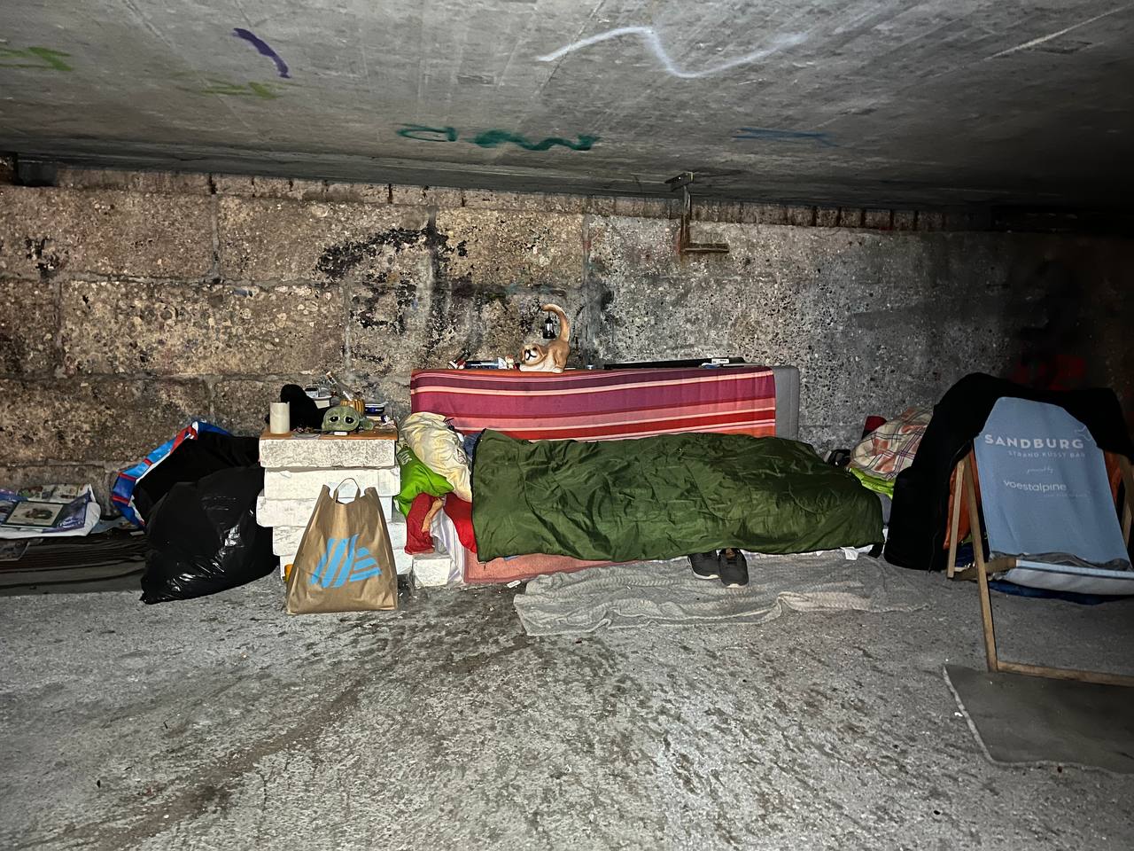 Max geht als Erster die Böschung hinauf, zu Franziskas Zelt und ruft ihren Namen. Emma, der kleine Hund von Franziska bellt laut und gibt ihrer Freude größten Ausdruck. Franziska windet sich aus dem Zelt, da kommt Emma schon mit der Leine zu uns und freut sich sichtlich, über unseren Besuch. Leider habe ich heute auf Leckerlies vergessen, aber ich habe Emma versprochen, beim nächsten Mal bekommt sie die doppelte Portion. Franziska braucht noch, ich gehe kurz rüber, wo früher Gerald lag, dort sind jetzt 4 Betten aufgebaut, und wir treffen S., die 2 gebrochenen Beine hatte und das rechte Bein ist nun so schmerzhaft schief zusammengewachsen ohne Operation, dass man von Weitem die Schiefstellung des Fußes sieht, und wie schmerzhaft das sein muss. S. ist 23 Jahre jung, hat einen Erwachsenenvertreter, der ihr wöchentlich € 20,- Taschengeld ausbezahlt, mit dem muss S. über eine ganze Woche kommen, was einfach lächerlich ist. Joachim wird sich bei einem befreundeten Rechtsanwalt erkundigen, was man hier gegen den Erwachsenenvertreter machen kann, wenn der seine Fürsorgepflicht missachtet. Wir bleiben sicher an diesem Fall, wo einer jungen obdachlosen Frau die ganze Verachtung gezeigt wird, dran.