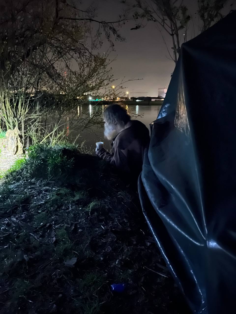 Nach ein paar Minuten beruhigt sich Peter einigermaßen, wir reichen ihm einen heißen Tee, den er dankend ablehnt, weil wenn er jetzt nach wochenlanger Kaltgetränkekur etwas Warmes trinkt, Zitat: „glaubt der Körper dass es warm ist und fährt sein System weiter herunter und dann friert mich“. Peters Logik! Wir geben ihm all die Batteriepackungen, die Socken und die Taschenlampen, er schüttet alles einfach unter die Gewebsplane und widmet sich wieder uns. Er droht mir jetzt auch, Zitat: „Ich brauche ein Solarpaneel mit einem 6000 Watt Akkupack, damit er einen Laptop und eine Lampe im Zelt betreiben kann. Er möchte gerne etwas lesen, er hätte gerne einige wissenschaftliche Bücher in Englisch, keine Ahnung wo ich so etwas bekomme, werde mich kundig machen. Nach einer gefühlten halben Stunde brechen wir wieder zum Bus auf, um die Linz-Tour weiterzufahren. Mittlerweile ist es 21.45 Uhr geworden und wir peilen als nächstes Ziel die Tankstelle in der Hafenstraße an, weil uns nach einem Kaffee ist, also auf nach Linz rüber wieder.
