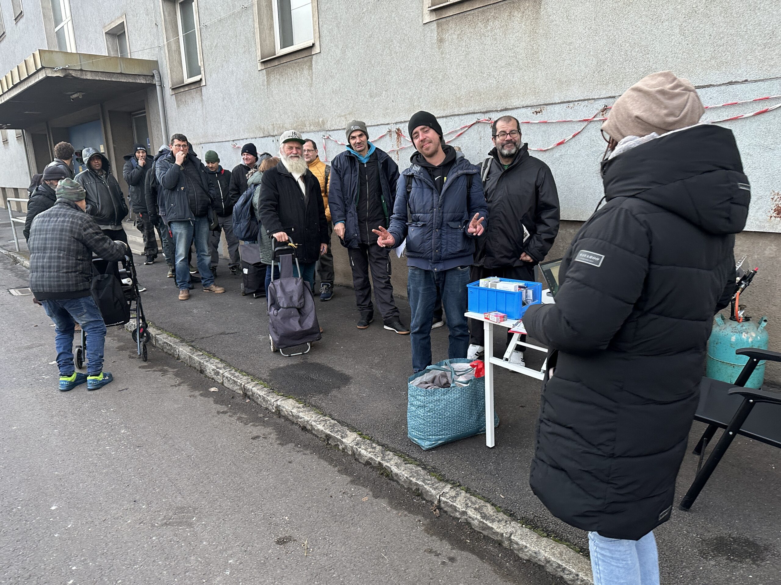 Um 16 Uhr beginnen wir mit der Ausgabe, unser Tony ist der Erste in der Warteschlange, ihn habe ich im Vorfeld mit unserem heißem Tee versorgt, den liebt er abgöttisch. Tony erzählt mir von seinem Freund Ing. Elmar, der seit über einem halben Jahr in einem Pflegeheim in der Provinz verschollen und unauffindbar ist. Ton macht sich große Sorgen um seinen Freund, und Elmar ist wahrlich sein echter und guter Freund. Wir machen weiter mit der Anmeldung und Michaela, die mir bei der Anmeldung behilflich ist, verteilt 2 Zigaretten an jede/n, wenig aber besser als keine.