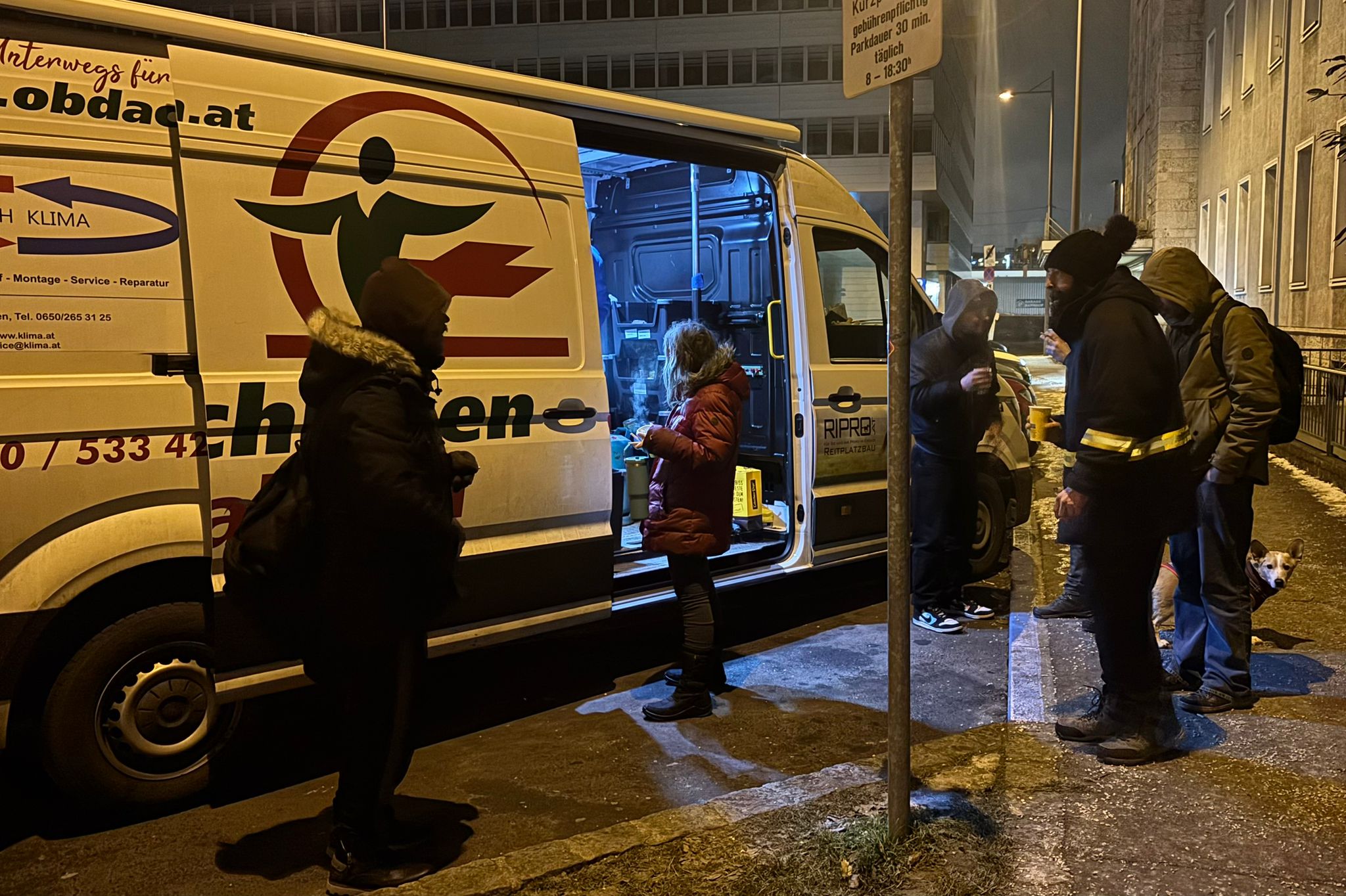 In der Postgarage angekommen ist Marco ganz stolz, dass er sich von der ÖBB-Security vor ein paar Tagen einen Besen ausgeliehen hat und dort unten sauber gemacht hat. Auch die Security erkennt den Willen von Marco und Gerry an und lässt wenigstens Gaby und die Anderen dort in Ruhe liegen. Wir nehmen Gaby mit zum Bus, unterwegs erzählt sie mir alle Neuigkeiten. Beim Bus angekommen warten schon einige unserer Schützlinge, sie alle wollen heißen Tee und 2 Zigaretten, eine heiße Leberkäs-Semmel und ein offenes Ohr.