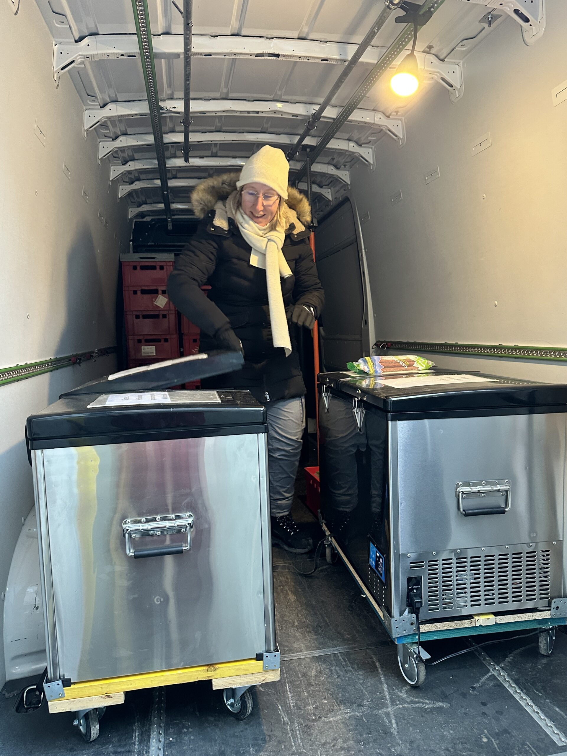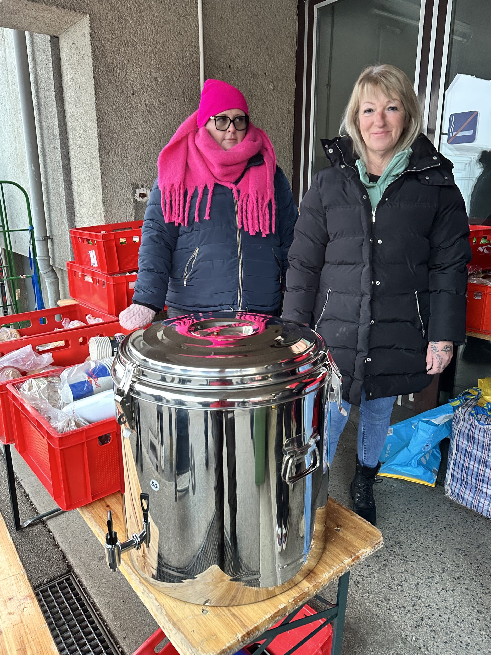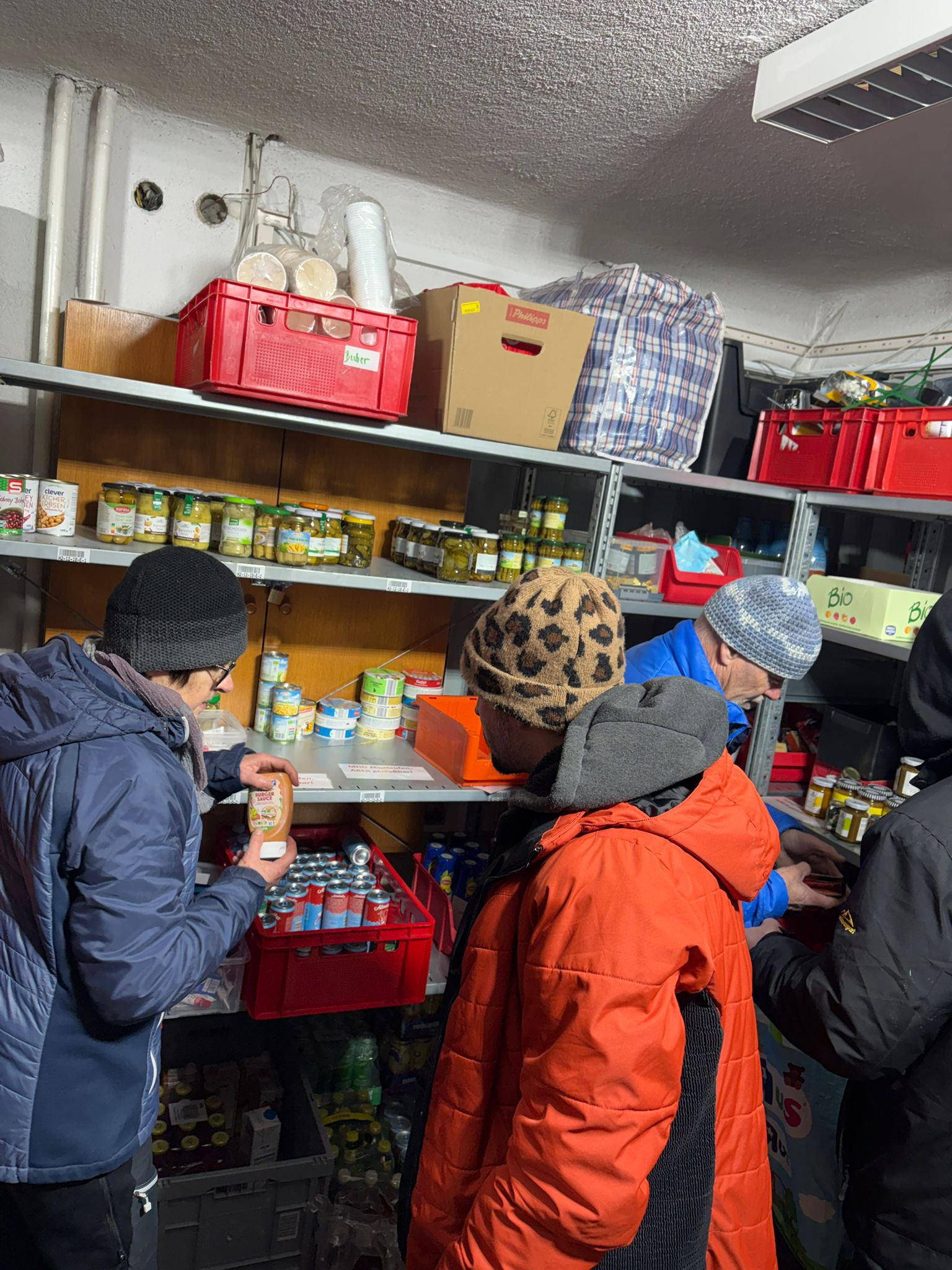 Die ersten Heizelemente machen Probleme, die Flaschen werden langsam leer. Aber gerade jene Menschen, die keinen Schutz vor der Kälte haben und auf der Straße ausharren müssen, brauchen zumindest am Verteil-Donnerstag irgendwo eine Quelle, wo sie sich wärmen können. Günther und Karola lagern die mitgebrachten Lebensmitteln im Büro ein, Michaela und alle anderen kümmern sich um die Tische und Boxen heraussen, dass diese richtig angeordnet sind.