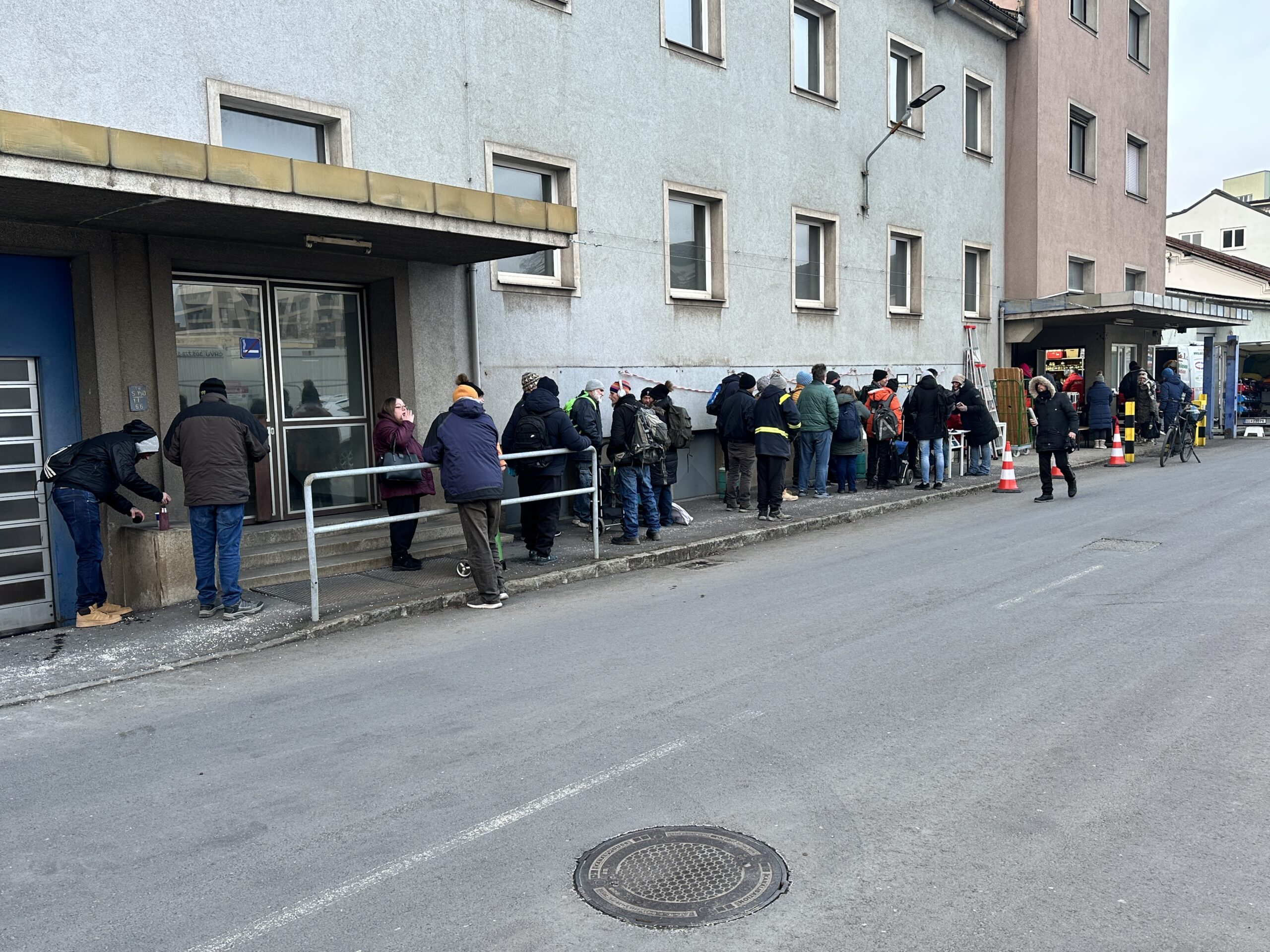 Nach dem Wechsel in die Ski-Handschuhe ist es besser geworden, aber immer noch nicht wirklich warm. Die Warteschlange ist schon echt lange, und am Ende werden es heute sagenhafte 168 Menschen sein, die sich bei uns das Nötigste holten. Da sind aber jene, die Max an der Ameldung vorbeischleuste weil sie zu lautstark zu stänkern begonnen hatten, noch gar nicht mitgerechnet. Die Besucherzahlen gehen seit Monaten in nur eine Richtung, anch oben.