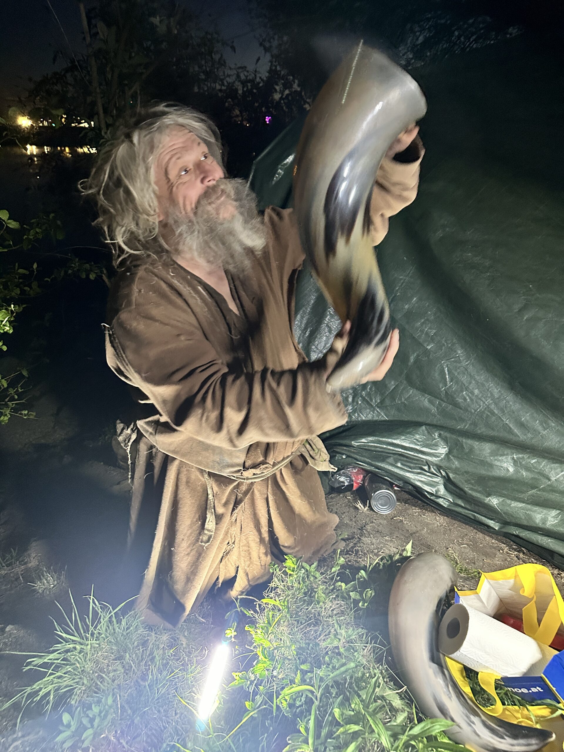 Der 2. P. hat mir angeschafft, Akku-Packs bei Pearl zu besorgen, mit Solarpanel, damit er die Akku-Packs wieder aufladen kann. Ganz ehrlich, P. erzählt schon viele Monate von diesen Akku-Packs, die er unbedingt haben will, aber ich habe keine Ahnung wie ich 18 Stück schwere Akku-Packs à etwa 30kg zu ihm bringen sollte, da er total abgelegen lebt, wo ich nicht zufahren kann. Wir laden unseren Bollerwagen mit 3 Sackerl Lebensmittel voll und gehen Richtung Donau. Der Schein unserer Taschenlampe zeigt uns den Weg durch einen kleinen Wald, wo im Frühling und Sommer gerne Wildschweine lauern und gefährlich werden könnten, für uns. Ich achte auf jedes Geräusch und bin sehr angespannt. Auf dem Weg zu P. sehen wir eine Taschenlampe etwa 100 Meter vor P.‘s Verbau und er redet mit jemanden. Ich habe P. noch nie außerhalb seines Verbaus angetroffen, was mich aber heute sehr freut. Und schon legt P. los und erzählt hochintelligente Dinge und absolut nicht nachvollziehbare Floskeln in einem. Ich kann nur schwer folgen, weil: „Wenn der E28 kommt seid ihr alle dran“, meint P.. Wer immer E28 sein mag, lt. P. werden wir ständig vom Himmel aus beobachtet und bei größeren Fehlern eliminiert. Puh, ja! P. erzählt mir von all seinem Geld und seinen Vorhaben, unser Thomas gibt P. die 3 Sackerl mit den Lebensmitteln, wir hören P. noch ein wenig zu und verabschieden uns dann wieder. „Ich brauche noch dringend 12Stk. 5l Pump-Thermoskannen, damit ich Trinkwasser bunkern kann“, ich antworte ihm dass ich mich erkundigen werde und gehe Max und Thomas nach, zum Bus.