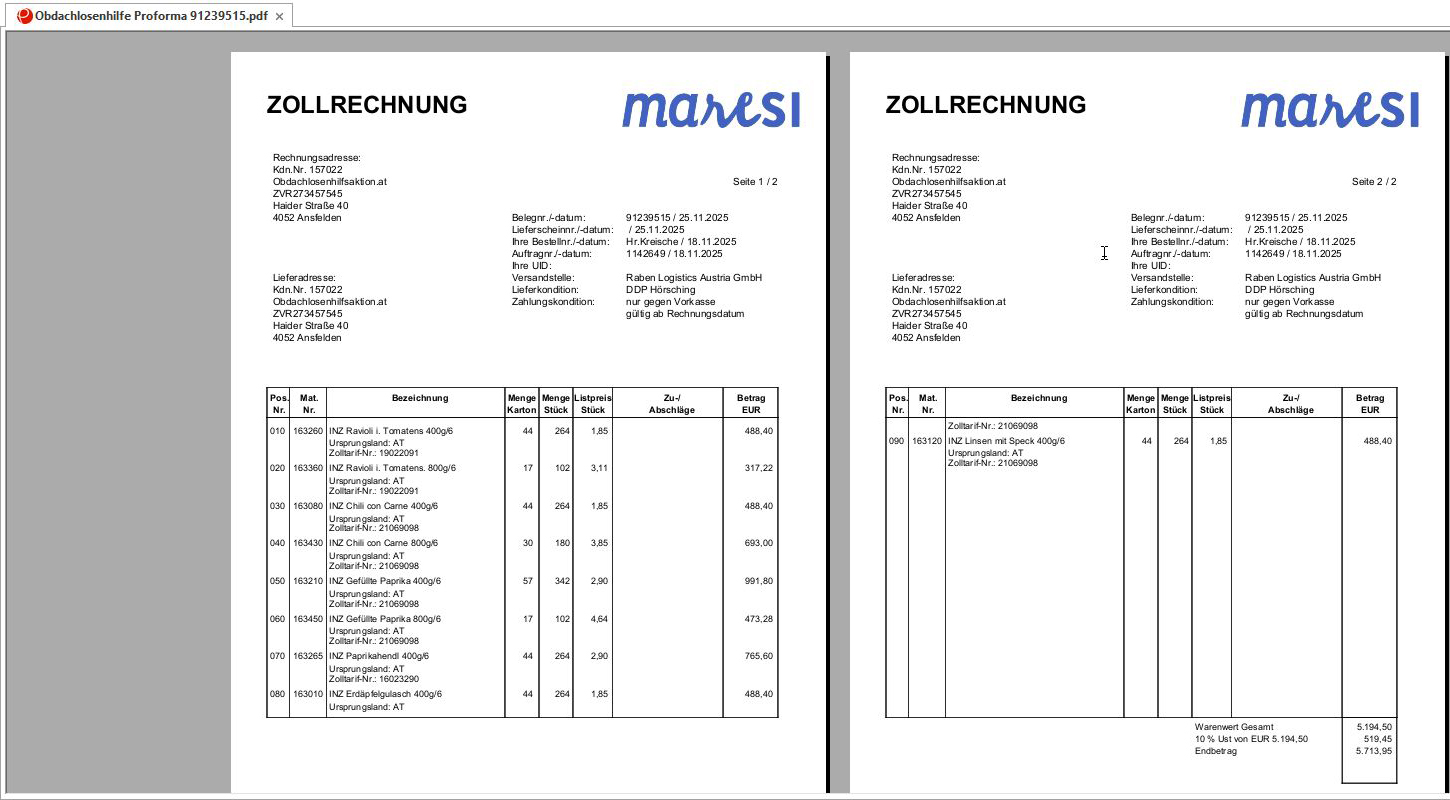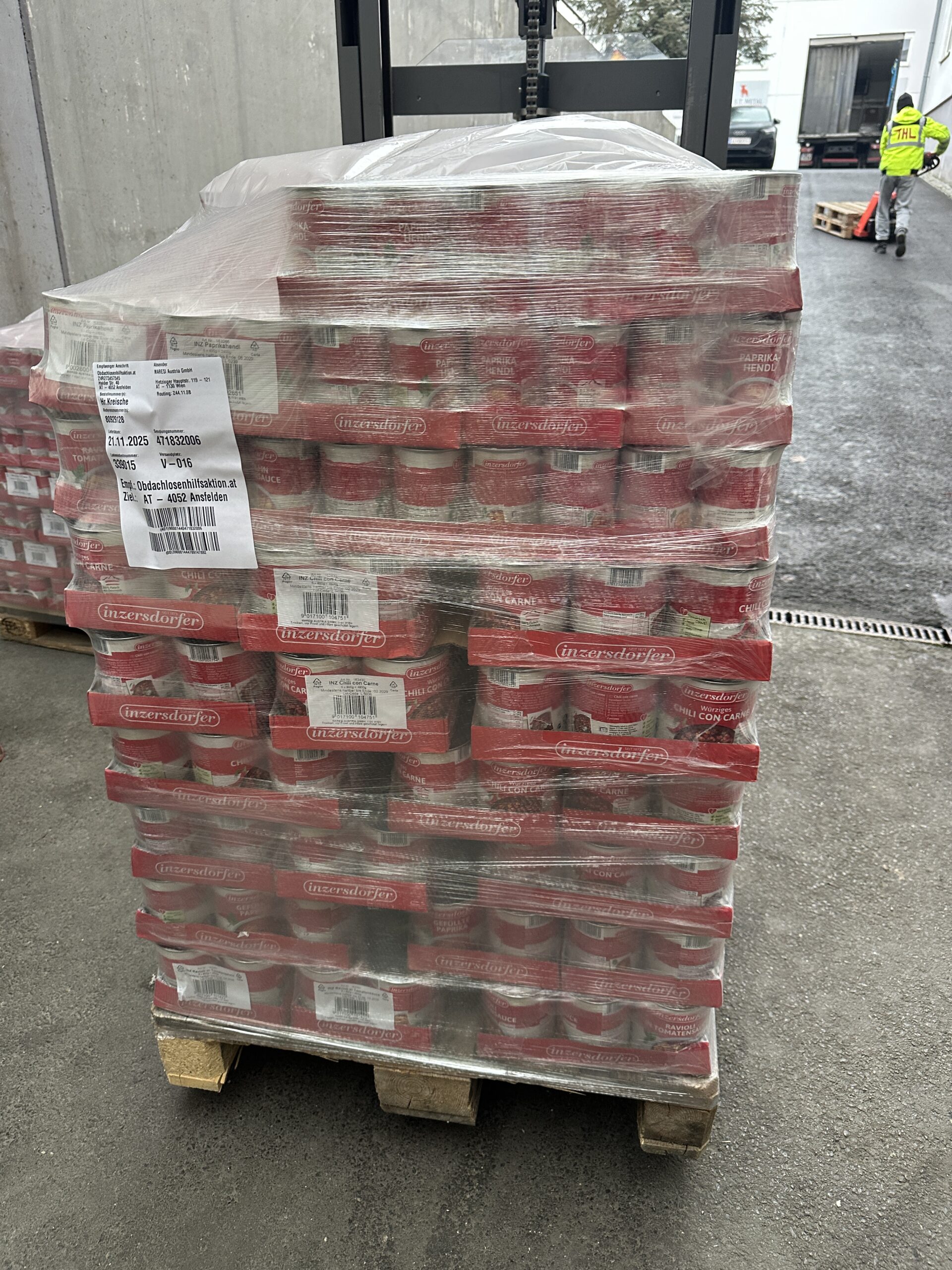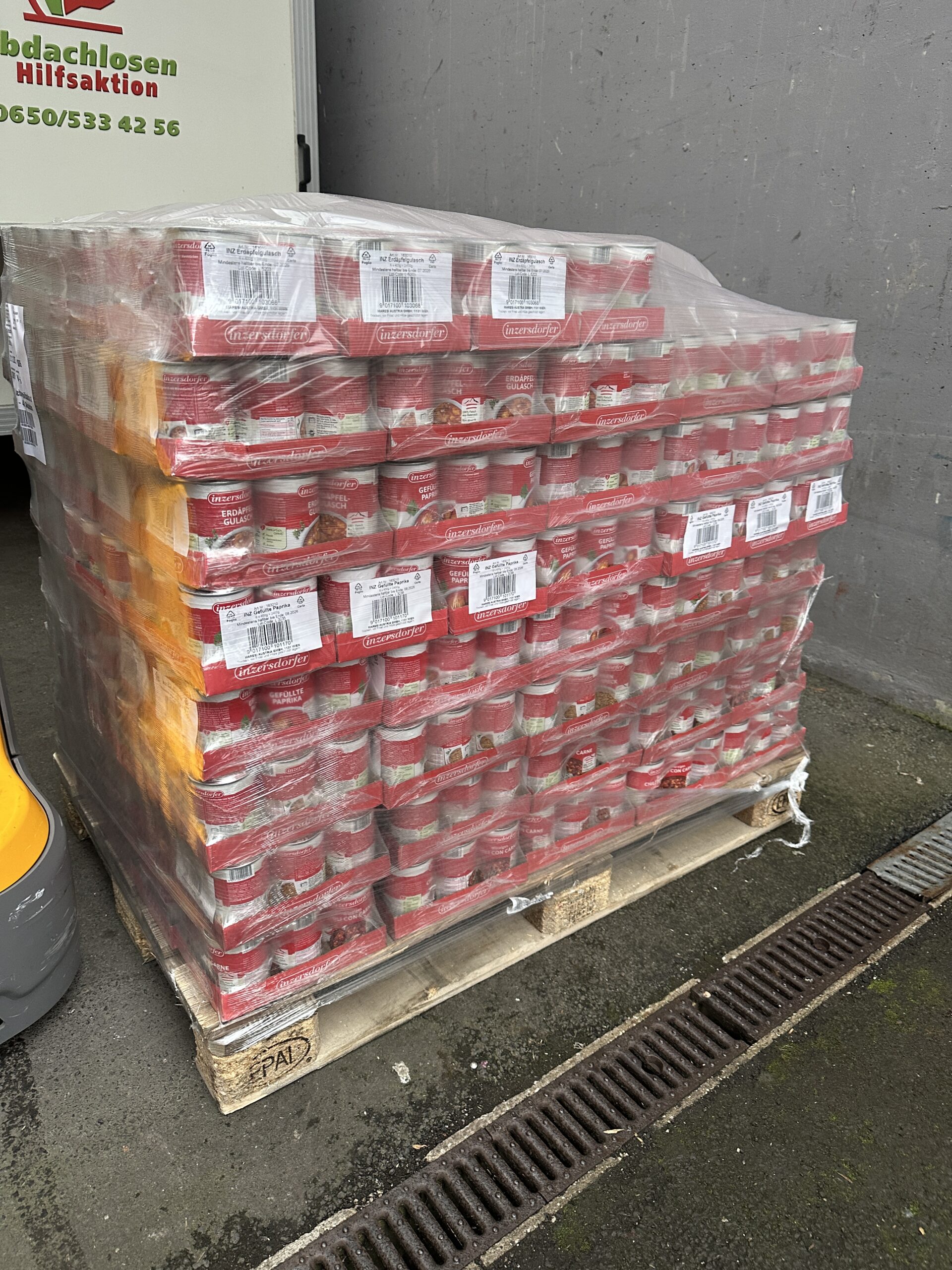 Bestellung lautete auf: 1662 Dosen 400g (diverse haltbare Fertiggerichte) und 384 Dosen 800g, ebenfalls diverse haltbare Fertiggerichte. Bezahlt haben wir dafür, ersichtlich in der beiliegenden Rechnung, € 5713,95.